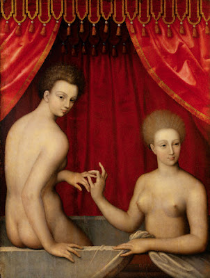 Apr. 20th, 2009 05:35 pmЭта картина неизвесного французского автора конца 16 века казалась мне из серии "Что бы это значило?" Оказалось, что эти дамы фигурируют ещё, по крайней мере на двух картинах того же времени. Обратите внимание, что блондинка держит перстень в левой руке.